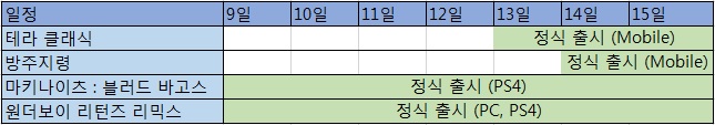8월 9일부터 15일까지는 총 4종의 타이틀이 출시될 예정이다. 모바일 플랫폼으로는 카카오게임즈의 모바일 MMORPG '테라클래식'과 디앤씨오브스톰의 수집형 RPG '방주지령'이 있으며 PS4 플랫폼으로는 '마키나이츠:블러드바고스'와 '원더보이리턴즈리믹스'가 발매된다.