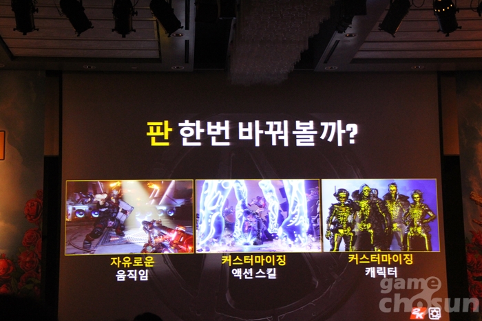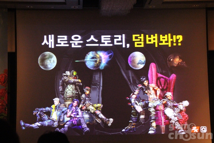 간단한 소개 인사와 함께 보더랜드3의 게임 소개 프레젠테이션을 진행하는 제작진 = 게임조선 촬영