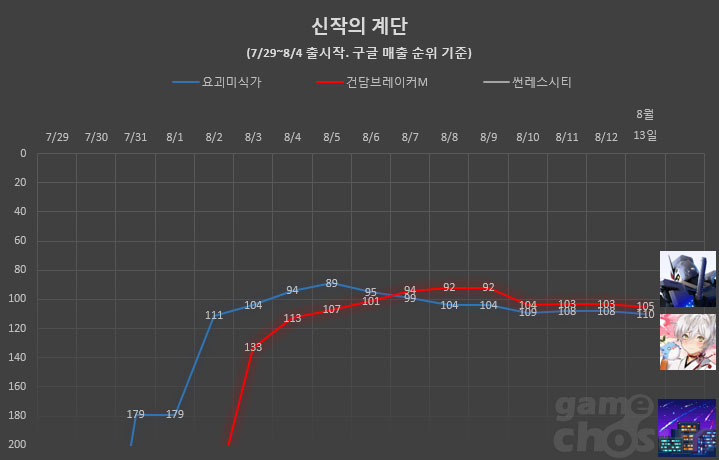 건담브레이커M이 아슬아슬한 차이로 요괴미식가를 따라잡은 것이 특징. 둘 다 순위가 하락한 형국이기 때문에 요괴미식가의 하락폭이 더 컸다고 보는 것이 옳겠다. 8월 중순을 지나며 이름 있는 대작들이 나오기 시작하면서도 자리를 지킬 수 있을 것인가-가 관건이 될 것으로.