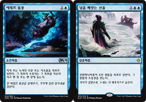 에테르 돌풍은 준드 공룡처럼 크고 강력한 생물을 한 템포 끊어주어 시간을 많이 벌 수 있게 합니다. 상대가 서고 위로 돌려둔 카드는 다음에 무효화를 할 수도 있습니다. 드물지만 내 ‘밤무리 매복병’에 사용해서 상대의 생물 견제 수단으로부터 밤무리 매복병을 살려낼 수도 있습니다.