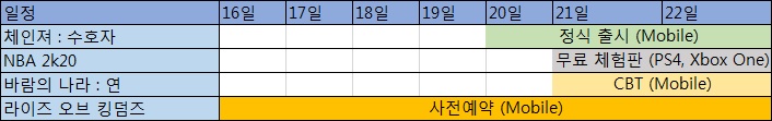 우선 '어썸피그'의 모바일 액션 RPG, '체인져:수호자'는 20일 정식 출시를 앞두고 있으며, 'NBA 2k20'은 21일부터 PS4와 Xbox One, 그리고 닌텐도스위치 플랫폼으로 무료 체험판을 배포할 예정이다. '넥슨'의 기대작 모바일 MMORPG '바람의나라:연'은 21일부터 CBT에 돌입한다. 마지막으로 '라이즈 오브 킹덤즈'는 금일부터 사전예약을 시작했다.