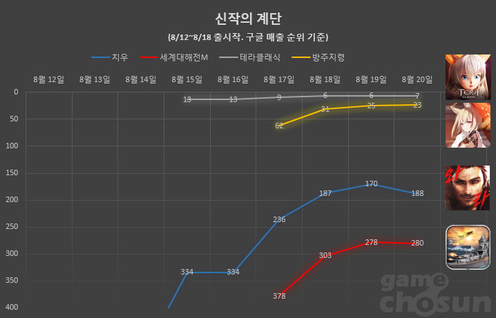 중국발 자동 MMORPG 치우를 가지고 온 썸에이지와 캐릭터화 아닌 정통 함대 장르 세계대해전 모두 차트 진입에 성공했다.