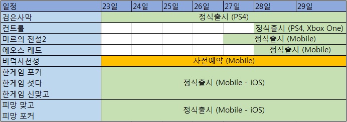 전세계적으로 큰 인기를 누린 국산 MMORPG '검은사막'이 PS4 플랫폼으로 정식 출시했다. 이와 더불어 지난 14일부터 16일까지 총 3일 간 비공개 시범 테스트(이하 CBT)를 진행한 바 있는 '미르의 전설2 어게인'이 27일 출시할 예정이며, 에이치투인터렉티브의 '컨트롤'이 PS4와 Xbox One 플랫폼으로 발매된다.