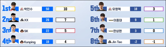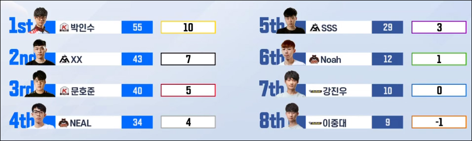 문호준 선수가 5, 6경기를 연속으로 잡아내며 선전하긴 했지만, 초반 4연승으로 빠르게 승점을 쌓아둔 박인수 선수가 7경기를 잡아내며 승점 55점을 따내며 3세트를 가져간다.