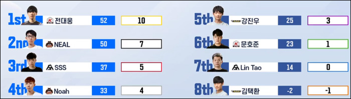 한편, 문호준 선수는 40점으로 5위, 강진우 선수는 10점으로 7위, 이중대 선수는 9점으로 8위를 차지했다.