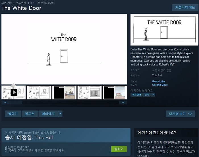 한국어를 포함한 총 17개의 언어를 지원하며, 올 가을 스팀 플랫폼과 모바일 (안드로이드, iOS) 플랫폼으로 출시될 예정이다. 아래는 '화이트도어'의 신규 티저 영상이다.
