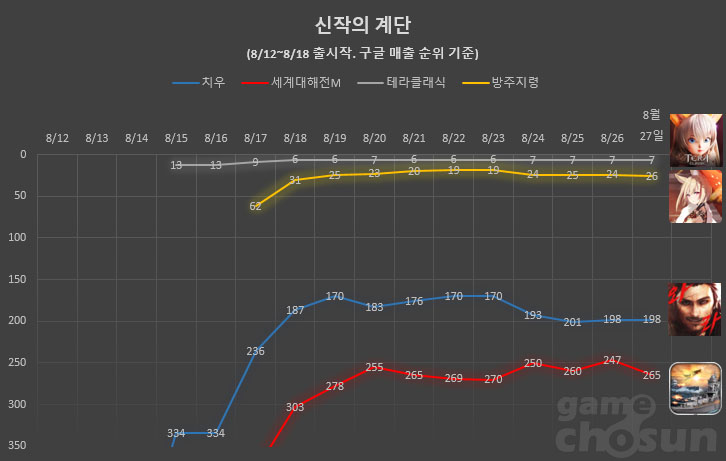 (유주게임즈, 8/20 : 496위 → 243위 → 244위 → 124위 → 91위 → 83위 → 71위 )