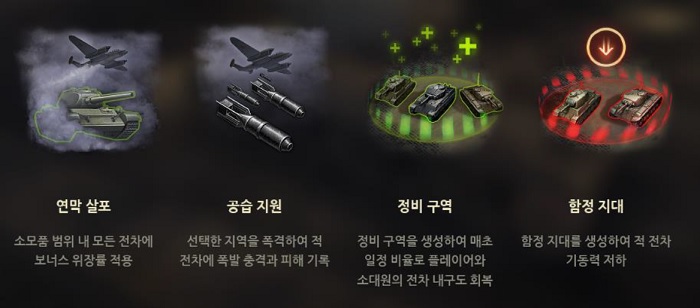 전시 물자도 존재한다. 전시 물자는 1회용 특수 스킬 개념을 가지고 있는데, 연막 살포와 공습 지원, 정비 구역, 함정 지대 등이 있다. 연막 살포는 적으로부터 자신의 모습을 감춤으로써 위기 상황에서 사용하기 적합하며, 공습 지원은 포인트를 지정할 경우 수 초후에 폭격이 이뤄진다. 위력이 매우 강하므로 전투의 흐름을 바꾸기 적합한 아이템이다. 정비 구역은 전차의 체력을 회복할 수 있는 구역을 형성하며, 함정 지대는 적 전차의 속도를 느려지게 하는 구역을 형성한다.