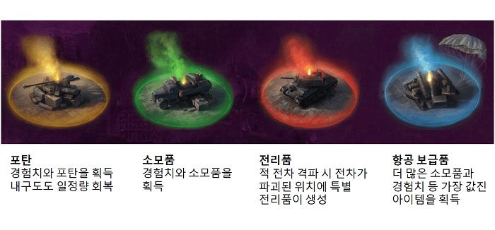 전차 강화를 위해서는 경험치를 얻어야 하는데, 보급품을 획득하거나 적 전차를 타격 및 파괴하면 된다. 게임 내에서 주어지는 보급품은 3종이 있다. 포탄과 소모품(경험치와 소모품), 그리고 전리품이다. 전리품의 경우는 적 전차를 파괴했을 시에 해당 위치에 특별 전리품 형태로 형성된다. 그리고 또 하나, 항공 보급품이 존재한다. 공중에서 보급품을 투하하는데 여기에는 매우 귀중한 아이템이 들어있으므로 전투의 판도를 바꾸는 요소가 된다.