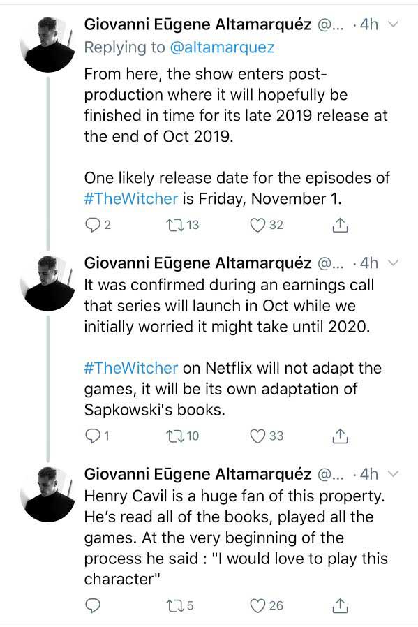8월 29일 넷플릭스의 TV프로그램 제작자 (executive producer) 중 한 명이라고 밝힌 ' Giovanni Eūgene Altamarquéz'가 트위터를 통해 "더 위쳐 드라마 첫 시즌이 10월 말까지 제작이 완료될 것으로 보이며, 11월 1일부터 방영된다"고 전한 것.