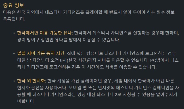 국내에서는 PC방이라는 문화를 통해 데스티니가디언즈를 플레이하는 사람이 있고, PC방 혜택이 별도로 존재하기 때문에 추가적인 안내가 이뤄진 것이다. 해당 안내문에는 한국에서만 이용 가능한 경이 방어구 상인 '유나'의 이용방법과 모바일 앱, 번지넷 등에서 데스티니가디언즈 대신에 데스티니2 라는 명칭이 사용될 수 있다는 내용 등이 담겨 있었다.