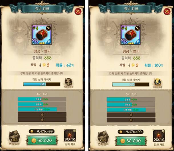 장비 강화 실패를 거듭하게 되면 강화 실패 게이지가 상승하여 강화 성공 확률을 보정 받을 수 있도록 강화 시스템이 개선된다. 강화석과 골드 등 재화 소모의 원인이었던 강화 부담이 큰 폭으로 낮아질 것으로 보인다.