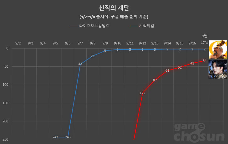첫 주부터 바로 상위권에 랭크되어 2위까지 거머쥔 라이즈오브킹덤즈와 첫주 성적은 다소 낮았으나 쭉쭉 상승하여 34계단까지 올라선 기적의검 모두 높은 성적을 거두었다.
