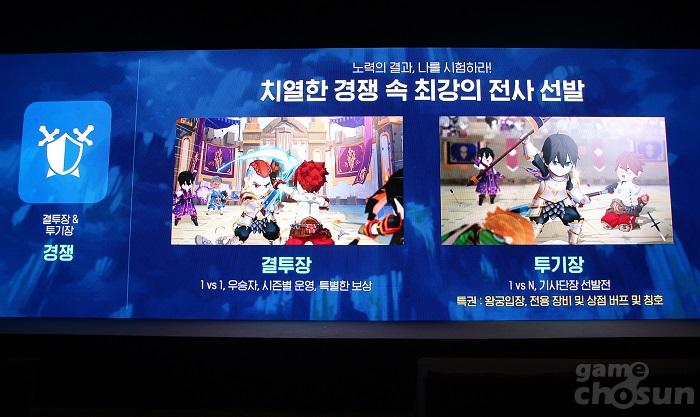 '기사단장 선발전' 콘텐츠 또한 눈여겨 볼만 한데, 토너먼트 방식의 대전을 통해서 우승한 모험가는 '기사단장'이 돼 칭호와 장비, 전용 퀘스트, 왕궁 입장 권한을 얻는다. 또 '결투장' 콘텐츠를 통해서 1vs1 전투를 즐길 수 있는 콘텐츠도 만나볼 수 있다. 필드 PvP 모드와 길드전에 대한 언급도 있었다.