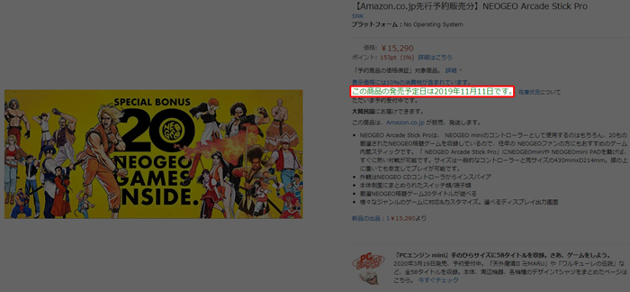 격투게임 명가 SNK가 만드는 신규 게임기 '네오지오 아케이드스틱프로(이하 아케이드스틱)'의 출시 예정일이 아마존 재팬을 통해 공개됐다.