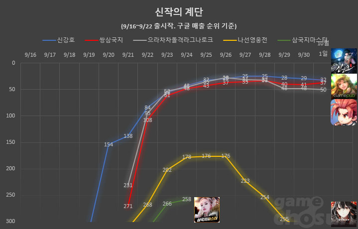 상위권에 올라섰던 신강호, 쌍삼국지, 으라차차돌격라그나로크는 모두 전주 순위를 잘 유지 중에 있으나 하위권이던 나선영웅전은 큰 폭으로 하락한 것이 특징.