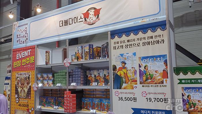 2관을 통채로 사용한 코리아보드게임즈는 이날 깜짝 신작인 네메시스를 공개했으며, 아컴호러 카드게임, 글렌모어 연대기, 오딘을위하여 확장, 블랙아웃홍콩, 퍼실리티 등 다양한 신작을 대거 첫 공개했다. 행복한바오밥은 도쿄하이웨이와 미니빌레거시, 가니메데 확장 등을 선보였으며, 만두게임즈는 카스텔로메쏘니와 퀸즈, 맨해튼 확장 등을, 보드피아는 트랩워즈를 신작으로 선보였다. 보드게임 오프행사에 처음 모습을 드러낸 데블다이스는 메디치 보드게임과 메디치 카드게임을 시작으로 향후 발매할 로드맵을 공개하고 선주문을 받기도 했다.