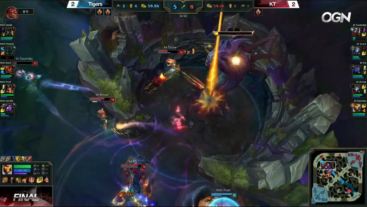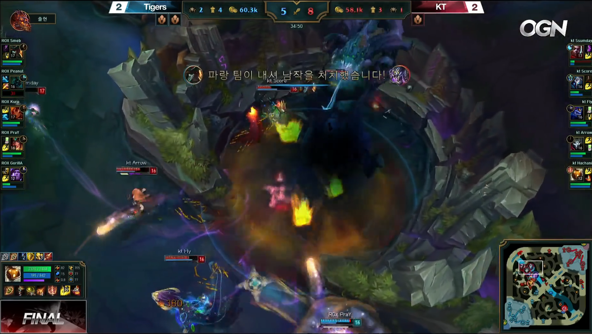 그런데 이 선수 어떻게 된 게 잘나가다가 결승전만 가면 꾸준히 잘해주던 팀원이 결승전만 가면 상태가 메롱이 되거나 환사 주문 강타를 썼는데 내셔 남작의 체력이 2가 남아서 갱플랭크의 글로벌 궁극기인 포탄 세례에 빼앗기는 식으로 묘하게 경기가 안 풀리는 징크스가 있었습니다.