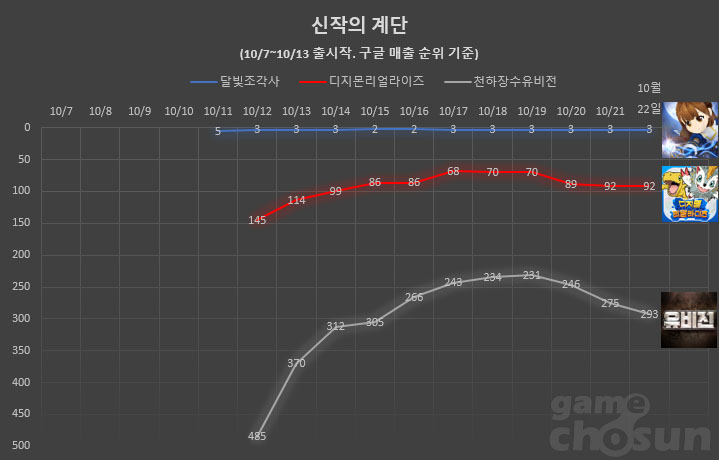 디지몬리얼라이즈와 천하장수유비전은 첫 주 상승세를 잃고 소폭 하락했다.