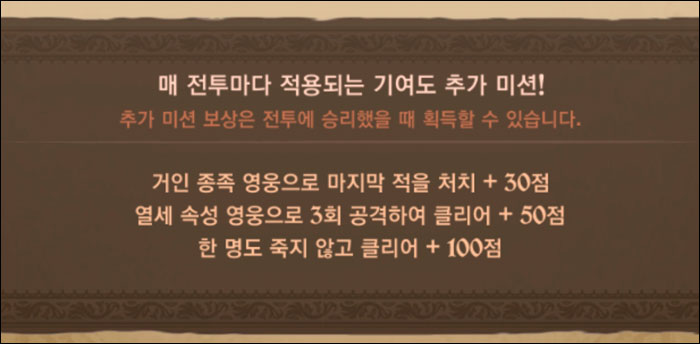 '기사단 보스전'과 '이벤트 보스전'에는 미션 시스템이 있다. 'HP xx%이상 남기고 클리어', '필살기 쓰지 않고 클리어'같은 조건을 만족하면 추가 포인트를 획득할 수 있는 것. 이는 상위급 유저들의 도전의식을 자극하는 콘텐츠로 십분 활용되고 있는 중이다.