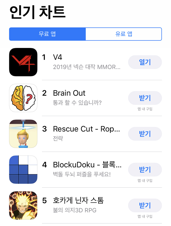 넥슨(대표 이정헌)의 하반기 최고 기대작 V4가 6일 오전 10시부터 시작한 사전 다운로드만으로 애플 앱스토어 무료 앱 인기 차트 1위에 올랐다.