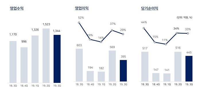 펄어비스(대표 정경인)는 8일 2019년 3분기 실적 발표를 통해 2019년 3분기 연결기준 매출 1,344억원, 영업이익 395억원을 달성했다고 밝혔다.