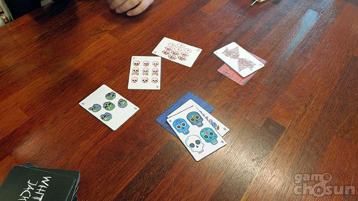 파란 카드와 빨간 카드를 나누어 배치하는 화이트잭 = 게임조선 촬영