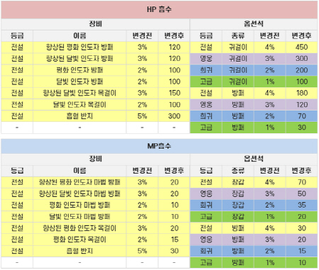 공식 커뮤니티를 뜨겁게 달궜던 직업간 밸런스 및 흡수 옵션에 대한 조정도 함께 업데이트됐다. 특히 MP흡수 옵션의 경우 사냥 필수 옵션으로 불릴 정도로 이용자들에게 사랑받는 효과였지만, 아이템 등급에 비해 월등히 좋은 효과를 보여줘 고정 수치로 변경됐다.
