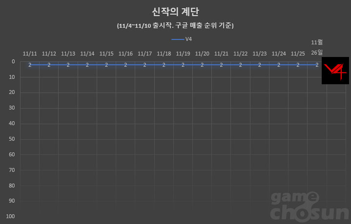 V4는 V4였다. 최고 매출 순위 2위를 거머쥔 이래 한순간도 자리를 내주지 않은 채 순위를 견고하게 지켰다. 그렇게 자존심을 지킨 채로 2019 최대의 도전자, 리니지2M과의 결전을 앞두고 있는 상황. 론칭 이후 유일하게 못 따라잡은 '벽'도 '리니지M'인 만큼 그 형제격 경쟁작에 더 자리를 내주기 싫을 것.