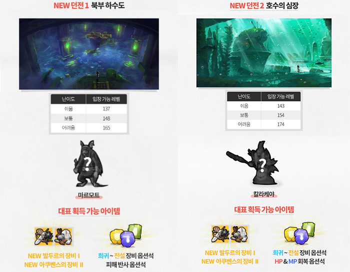 신규 던전 '북부 하수도'는 생쥐 인간 보스 '마르모트'가 등장하는 던전으로 입장 레벨은 쉬움 137, 보통 148, 어려움 165다. 북부 하수도의 보상은 신규 아이템 '발두르의 장비 I'과 '아쿠벤스의 장비 II', 장비 옵션석이며, 신규 옵션 '피해 반사' 옵션석이 등장한다.