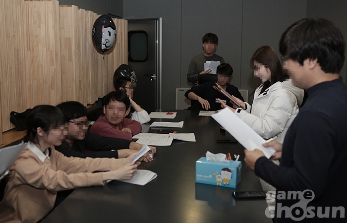 실제 성우들이 사용하는 것과 동일한 대본을 받아보고 읽는 모습 = 게임조선 촬영