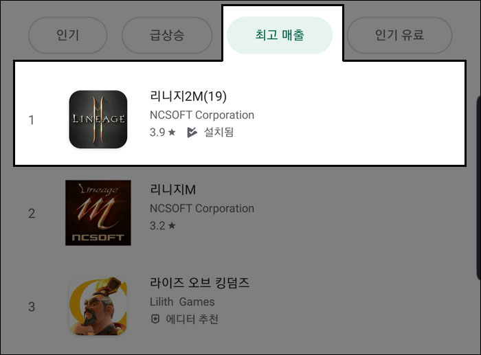 리니지2M은 출시 전 사전 캐릭터 생성만으로 양대 마켓 인기 1위, 출시 1일만에 애플 스토어 매출 1위, 구글 스토어 매출 4위를 기록한데 이어 4일만에 구글 매출 순위도 1위를 차지한 것.