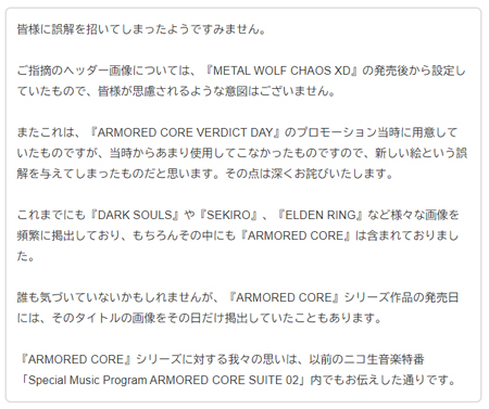 "여러분께 오해를 일으켜 죄송합니다. 지적하신 이미지는 '메탈울프카오스XD' 출시 후 게시한 것으로 여러분께서 생각하시는 의도는 없습니다. 또한, 이 이미지는 '아머드코어버딕트데이' 프로모션 당시 준비한 것으로 당시에는 사용할 기회가 없어 새로운 일러스트라고 오해를 일으킨 것 같습니다. 이 점을 깊이 사과드립니다. 지금까지 '다크소울'이나 '세키로', '엘든링' 등 여러 일러스트를 게시했으며, 당연히 그중에는 '아머드코어'도 포함돼 있었습니다. 아무도 눈치채지 못하셨을 듯하지만 아머드코어 시리즈 작품 출시일에는 해당 타이틀 이미지 당일 게재한 일도 있습니다. 아머드코어 시리즈에 대한 저희의 생각은 니코니코 음악 특집 방송 '스페셜 뮤직 프로그램 아머드코어 수트 02'에서 밝힌 것과 같습니다."