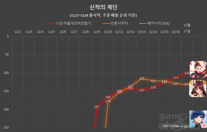 12월 초 출시한 타이틀 중 MMORPG 장르인 나인:아홉 개의 비전 절기만이 유일하게 상승 곡선을 그리고 있다. 사실 중소 게임이 출시 이후 보름 여가 지난 이후까지 상승세를 유지하기가 쉽지 않은 일임에도 이를 해냈다. 더 높은 순위까지 올라갔던 방치형 게임, 진혼사쿠라는 기세가 한풀 꺾였다. 장르 면에서도 그래픽 콘셉트면에서도 완전히 다른 두 게임은 각각 비슷한 수준에까지 올랐다가 다소 다른 양상을 보이고 있는 중.
