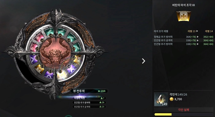 우선 각인석은 전투력을 높일 수 있는 콘텐츠 중 가장 효율이 높은 것으로 평가된다. 여타 전투력을 높일 수 있는 콘텐츠에 비해 전투력 상승에 대한 기대효과가 크고 수치 상승면에서도 높기 때문. 따라서 각인석을 입수할 수 있는 '토벌'과 '악마토벌'을 꾸준히 진행해주는 것이 좋다.