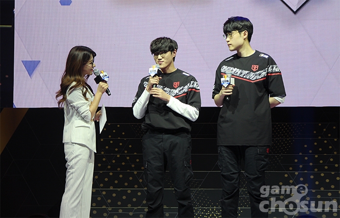 세트 MVP 인터뷰를 진행중인 레오와 온플릭 선수 = 게임조선 촬영