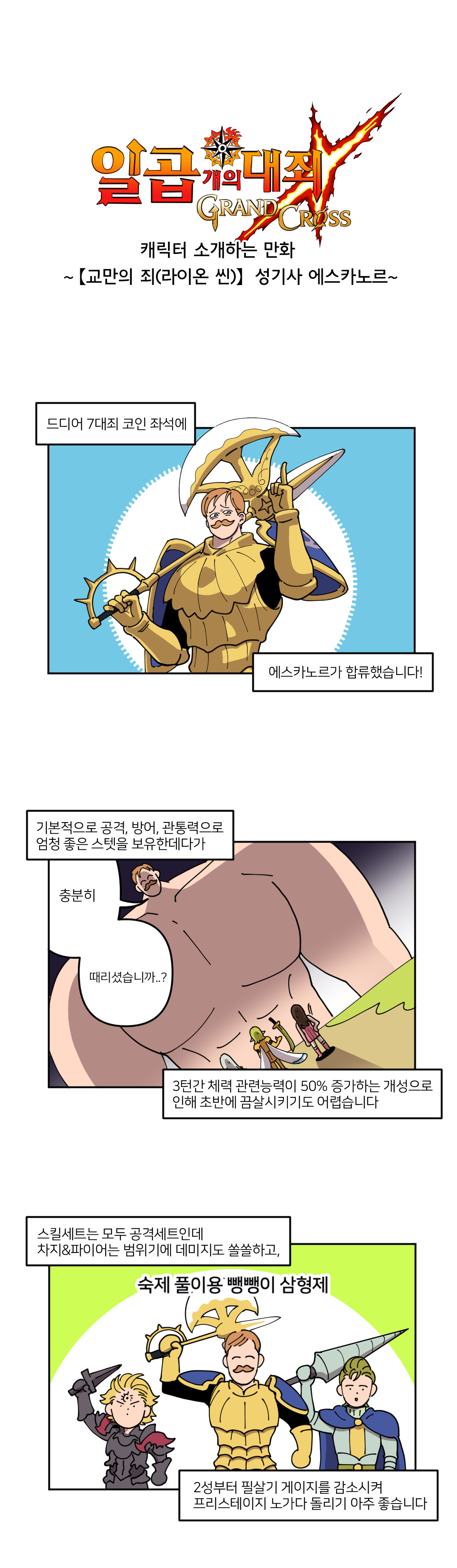교만의 죄 성기사 에스카노르는 이용자들 사이에서 코인 상점에서 구매할 수 있다고 하여, '코스카노르'라 불리운다. 스킬이 모두 공격형이며 '차지&파이어'라는 범위기도 가지고 있는 캐릭터, 코스카노르를 웹툰으로 살펴보자.