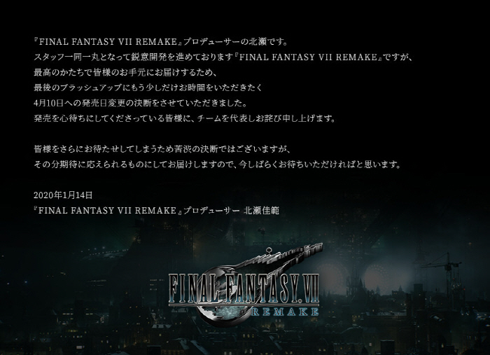 "FINAL FANTASY VII REMAKE' 프로듀서 기타세입니다. 스태프 일동이 한마음이 되어 열심히 'FINAL FANTASY VII REMAKE' 개발을 진행하고 있지만, 최고의 모습으로 여러분께 보여드리고자 마지막 작업에 조금 더 시간을 들이기 위해 4월 10일로 출시일을 결정하게 됐습니다. 출시를 고대하시던 여러분께 팀 대표로서 사죄드립니다. 여러분을 다시 한번 기다리게 만드는 힘든 결정이지만 그만큼 기대에 보답할 수 있는 작품을 전해드리겠으니 지금은 기다려주시길 부탁드립니다."