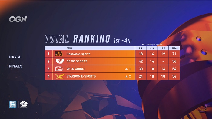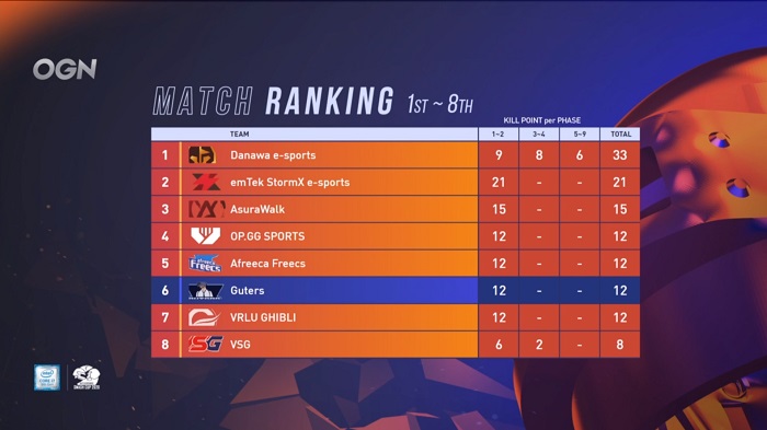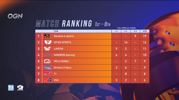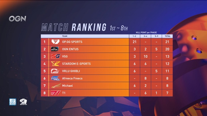 1페이즈 킬포인트 점수만으로 1위 생존팀을 눌러버린 오피지지의 교전능력은 실로 대단했다 = 스매시컵 공식자료