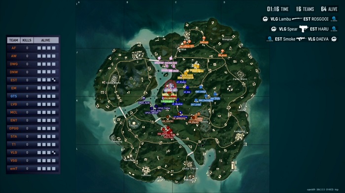 초반부터 몬테 누에보를 중심으로 자기장이 좁혀지면서 일찌감치 강하하여 파밍중이던 담원 게이밍, 오지엔 엔투스, 브이에스지, 티원, 다나와의 동선이 겹쳐 초반부터 난투가 벌어진다.