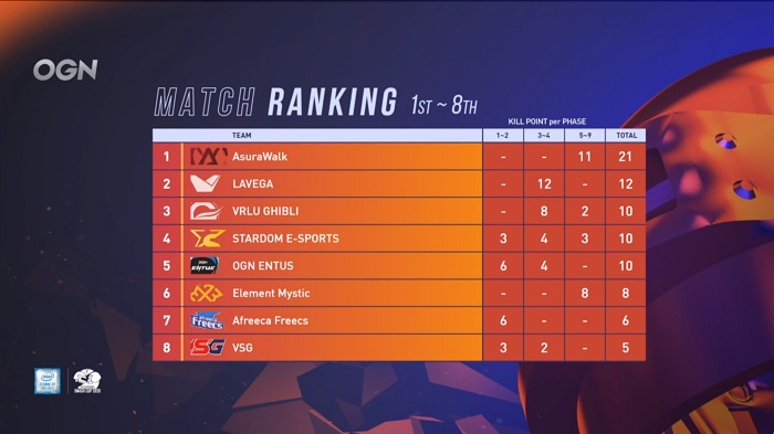 결국 마지막 페이즈에서 풀 스쿼드를 유지하며 한꺼번에 11킬을 기록한 아수라워크가 매치 우승 승점까지 합쳐 21점으로 1위 자리를 선점한다.