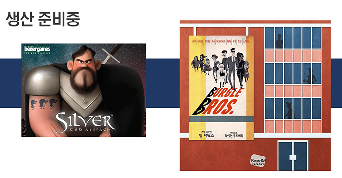 한편, 유재혁 대표에 따르면 '갓오브워'와 '시에라웨스트'는 곧 출시될 예정이며, 작년 공개된 '퍼스트콘택트'와 '스마트폰주식회사'는 생산 전 단계에 있으며, '실버(Silver)'와 '버글브로스'는 생산 준비중에 있다. 한동안 품절됐던 판타지 왕국은 생산 전 단계에 있으며, 러브레터 신판은 공동 생산 대기, 정령섬은 공장 변경 건으로 소폭 연기됐다고 밝히기도 했다.
