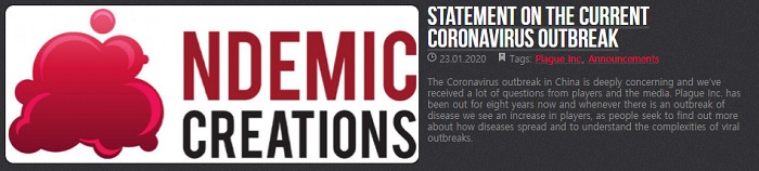 2012년 발매된 '전염병주식회사(Plague Inc.)'가 신종 코로나바이러스감염증, 통칭 우한 폐렴 이슈와 맞물려 모바일 양대 마켓 순위상승은 물론 PC, 콘솔판도 눈에 띄는 판매량 및 동시 접속자 수 증가로 역주행을 선보이고 있어 화제다.