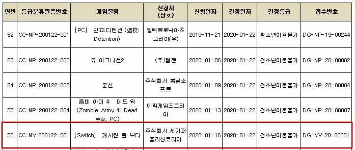 공표 내역에 대한 자세한 사항은 게임물관리위원회 공식 홈페이지 등급분류결정공표, 게임물 등급분류 결정공표(2020.2.12)의 '등급분류결정 게임물 등 통지(2020년도1월)'에서 확인할 수 있다. 엑스컴2콜렉션은 민간등급분류기관 등급분류 결정 게임물 목록, 캐서린풀보디는 게임물관리위원회 등급분류 결정 게임물 목록에 등재돼 있다.