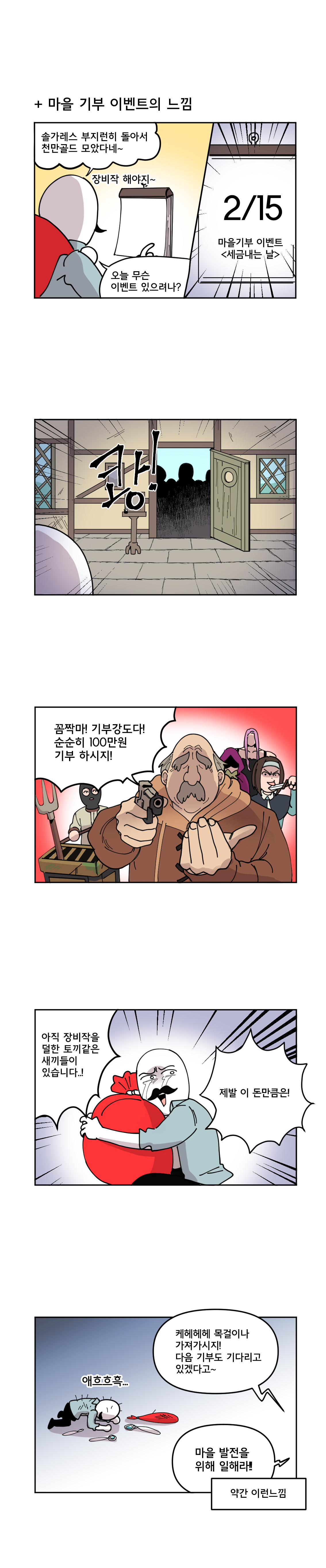 녹엘리에 대한 소개 외에도 '마을 기부 이벤트'에 대한 내용도 재치있게 표현해 큰 웃음을 주고 있다. 아래는 웹툰으로 보는 '일곱개의대죄:그랜드크로스' 6화, '아끼면 망해요, 왕녀 엘리'편이다.