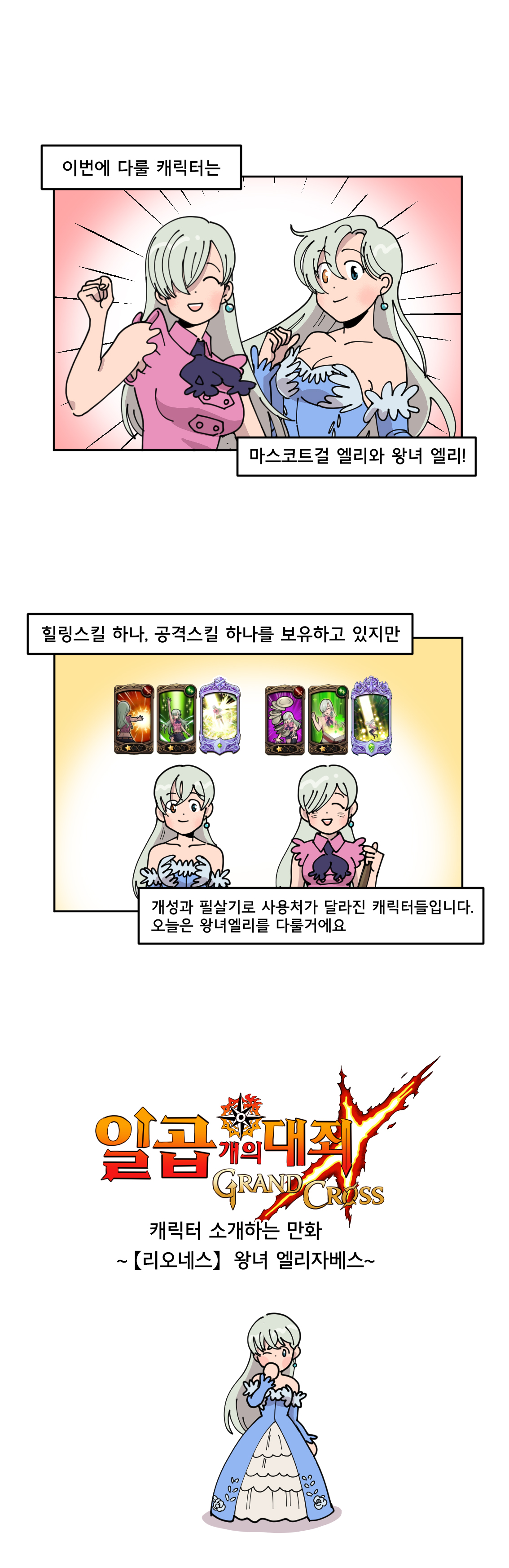 웹툰으로 보는 일곱개의대죄:그랜드크로스 6화에서 모습을 드러낸 영웅은 바로 '[리오네스] 왕녀 엘리자베스'다. 줄여서 '왕녀 엘리' 혹은 '녹엘리'라 칭해지는데, 본인의 필살기 게이지를 2칸 채운 채로 시작하는 개성 덕분에, 한 턴만에 필살기를 만들 수 있는 특징이 있다. 또, 필살기는 아군의 체력을 회복시키면서 필살기 게이지를 2칸 채우기에, '회색 마신 섬멸전'에서 사용되는 단골 영웅이다. 특히 필살기 게이지만큼 치명 확률이 증가하는 '[숲의 수호자] 요정왕 킹'과의 조합 효율이 매우 높은 편.