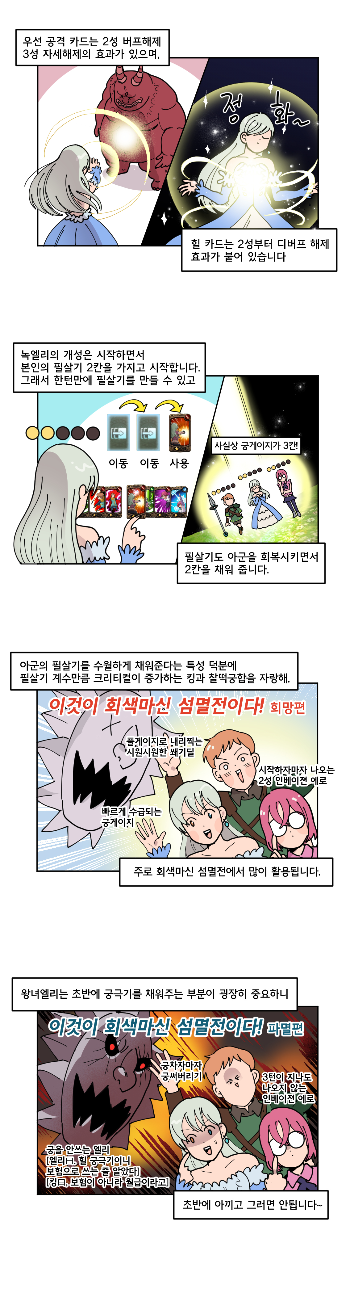 따라서 어떤 캐릭터로 어떤 조합을 하느냐가 매우 중요한데, 그 중에서도 몇몇 캐릭터는 덱 내에서 매우 중요한 역할을 한다. 이에 웹툰 작가 '국도'가 추천하는 영웅 캐릭터를 살펴봤다. 국도는 웹툰을 통해서 영웅 캐릭터를 추천하고, 해당 영웅을 어떻게 활용해야할지 재치있게 표현했다.