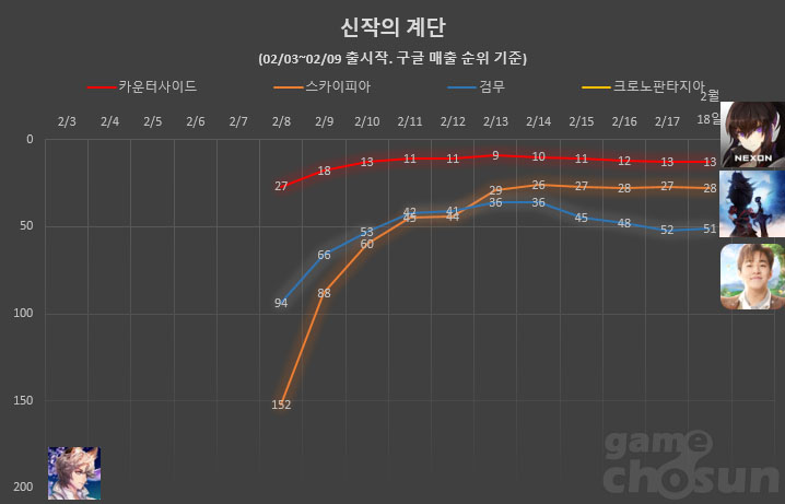 안 아픈 손가락이 없다는 게임사가 애달픈 심정으로 보내게 되는 오픈 첫 주. '신작의 계단' 코너를 통해 지난 한주 간 출시된 주요 신작들의 첫 주말 성적을 알아본다.