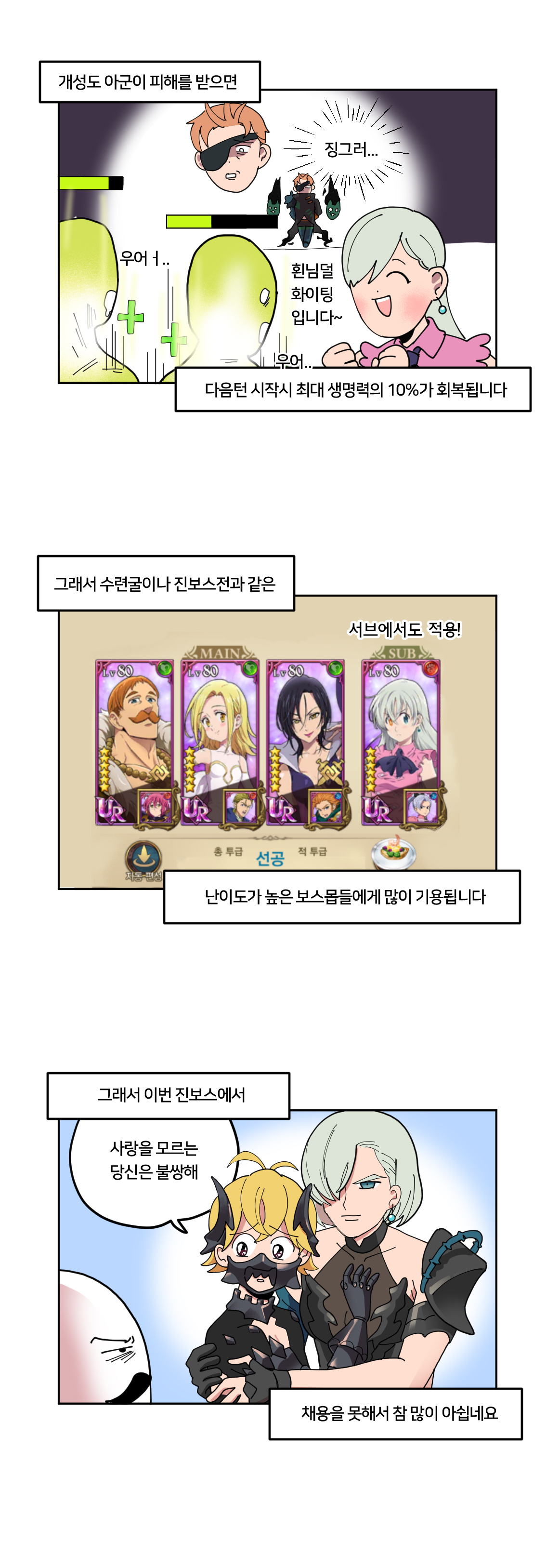 따라서 어떤 캐릭터로 어떤 조합을 하느냐가 매우 중요한데, 그 중에서도 몇몇 캐릭터는 덱 내에서 매우 중요한 역할을 한다. 이에 웹툰 작가 '국도'가 추천하는 영웅 캐릭터를 살펴봤다. 국도는 웹툰을 통해서 영웅 캐릭터를 추천하고, 해당 영웅을 어떻게 활용해야할지 재치있게 표현했다.