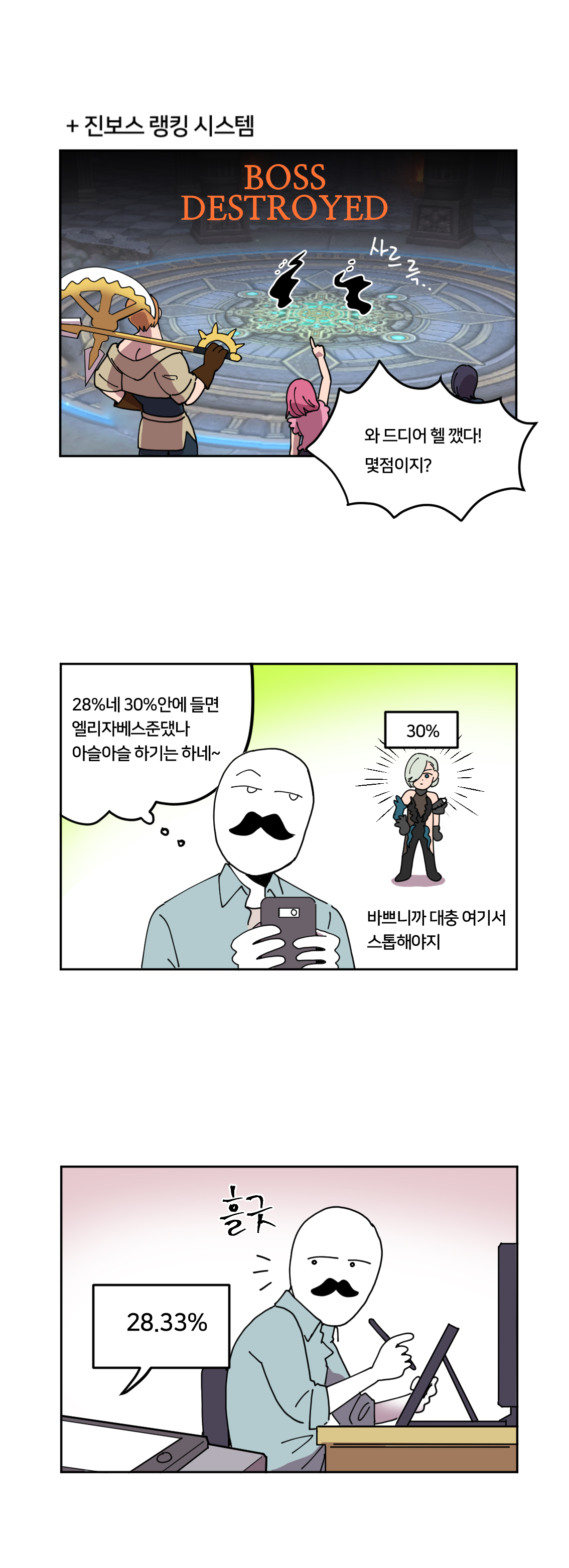 덕분에 일명 '좀비화 덱'을 구성할 때 가장 핵심이 되는 영웅이기도 하다. 좀비화 덱은 난이도가 높은 보스 몬스터 공략 시에 활용되는 편. 이번 7화에서는 '마스코트걸 엘리'에 대한 소개 외에도 엘리자베스 코스튬을 얻기 위한 처절한 진보스 랭킹전을 재미있게 풀어냈다.